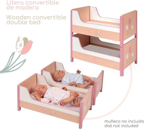 Das elegante 2-in-1 Holzpuppenbett aus der Tulipe-Kollektion begeistert mit zarten Pastelltönen und floralen Motiven. Dank der cleveren Lösung lässt es sich im Handumdrehen von einem Etagenbett in zwei separate Betten verwandeln. Inklusive 2 Matratzen, hochwertiger Verarbeitung und einfacher Handhabung – das ideale Zubehör für Puppenzimmer mit Puppen bis zu 48 cm.
