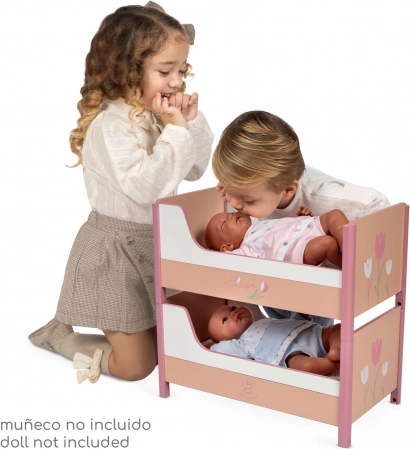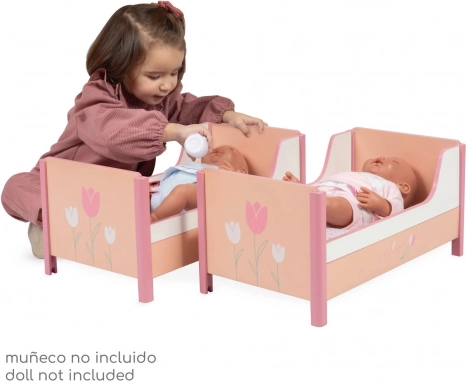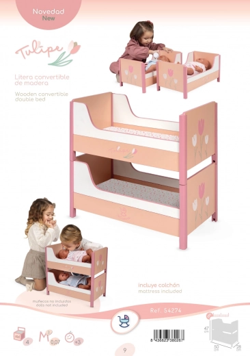 Schenken Sie Kindern eine wunderschöne Bühne für ihre Lieblingspuppen. Das 2-in-1-Bett aus der Tulipe-Kollektion in warmen Lachstönen mit stilvollem Blumenmuster bietet sowohl Etagen-Schlafplätze als auch die Möglichkeit, es in zwei einzelne Betten zu zerlegen. Präzises spanisches Design und eine robuste Konstruktion aus MDF und Massivholz sorgen für lange Haltbarkeit und sicheres Spielen.
