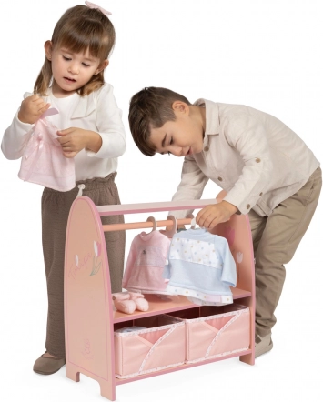 Der stilvolle Holz-Kleiderständer für Puppenoutfits mit zartem Tulpenmotiv passt perfekt ins Kinderzimmer. Er bietet eine Garderobenstange mit Bügeln, ein Regal und zwei faltbare Körbe für die übersichtliche Aufbewahrung von Accessoires. Dank der hochwertigen Holzausführung und der pastelligen Farben ist er ideal für den täglichen Spielspaß und die Organisation der Puppenausstattung.