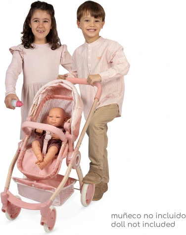 Dieser klappbare Puppenwagen überzeugt durch eine durchdachte Funktionskombination und wunderschönes spanisches Design. Die abnehmbare Babywanne kann in oder gegen die Fahrtrichtung angebracht werden und lässt sich leicht in einen sportlichen Sitz verwandeln. Dank des Dreipunkt-Gurtes sitzt die Puppe stets sicher und stabil.