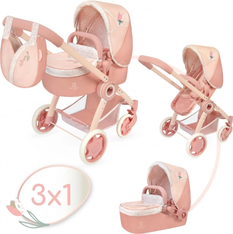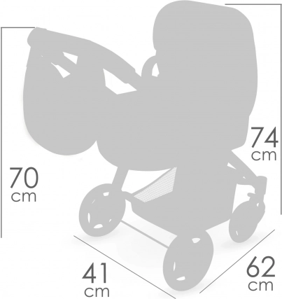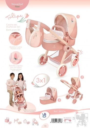Praktische Details bereichern das tägliche Spiel: schwenkbare Vorderräder für eine sanfte Fahrt, Aufbewahrungskorb für Kleinigkeiten, Tasche am Verdeck mit Stofftulpe und Glöckchen sowie eine dekorative Wannenabdeckung mit Klettverschlüssen und Täschchen. Der Wagen ist klappbar, nimmt daher wenig Platz ein und lässt sich leicht im Auto transportieren.