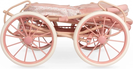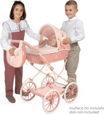 Mit dabei sind eine stylische Tasche in Tulpenform, ein klappbarer Sonnenschirm und eine weiche Matratze für die Puppe. Eine Ablagetasche am Verdeck, eine Verdeckabdeckung mit Druckknöpfen und ein geräumiger Korb unter dem Wagen fehlen ebenfalls nicht. Große Speichenräder und Federn ermöglichen sanftes Schaukeln und eine stabile Fahrt.