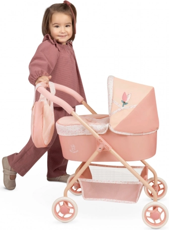 Dank der leichten und stabilen Konstruktion aus Metall und Kunststoff lässt sich der Wagen selbst von den Kleinsten mühelos schieben. Mit dabei sind Matratze, Aufbewahrungskorb und eine Tasche am Verdeck mit Stofftulpe und Glöckchen für noch mehr Spielspaß.