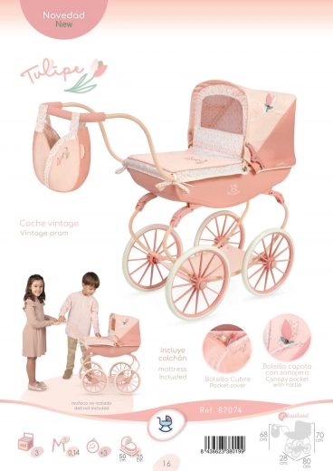 Der tiefe Puppenwagen aus der Kollektion Tulipe 2025 überzeugt durch präzise Verarbeitung und eine schöne Kombination aus helleren und dunkleren lachsfarbenen Pastelltönen mit zartem Blumenmuster. Dank der Federn zum Schaukeln und der weichen Matratze genießt die Puppe ein bequemes „Schläfchen“, während die klappbare Haube und die Abdeckung der Wanne sie bei Spaziergängen schützen.