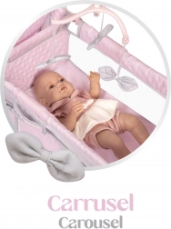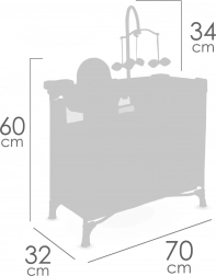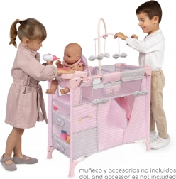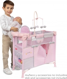 Inklusive umfangreicher Ausstattung für eine realistische Puppenpflege: Mobile mit Schleifchen, Wickelablage, Hochstuhl mit Kunststoff-Set, geräumiger Kleiderschrank mit Reißverschluss und Kleiderbügeln sowie zwei Ablagefächer. Das Bett verfügt über ein Netzfenster für bessere Sicht und Belüftung.