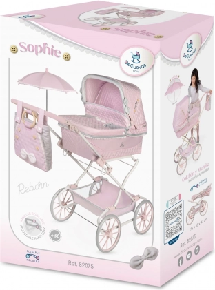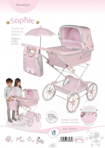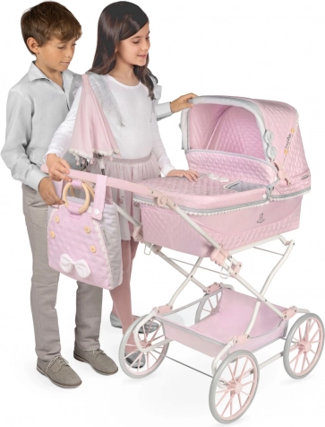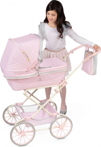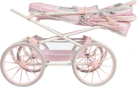 Der stilvolle Puppenwagen aus der zarten Sophie-Kollektion überzeugt mit hochwertiger Verarbeitung und romantischen Details in Rosa. Dank der höhenverstellbaren Schiebestange in 6 Positionen (65–90 cm) passt er sich perfekt auch größeren Kindern an und wächst mit ihnen mit. Die Federn im Fahrgestell ermöglichen ein angenehmes Wiegen, während die großen Speichenräder Stabilität und eine ruhige Fahrt gewährleisten.
