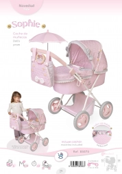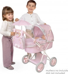 Entdecken Sie den romantischen Puppenwagen aus der SOPHIE-Kollektion mit zarten Spitzen und Schleifen. Das helle Rosa in Kombination mit grauen und weißen Details wirkt zauberhaft und unterstreicht das spanische Design sowie die präzise Verarbeitung. Der Klappmechanismus sorgt für bequemes Verstauen und Transportieren – perfekt für Spiele zu Hause und unterwegs.