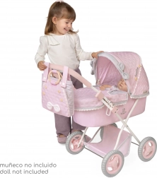 Der elegante Puppenwagen aus der SOPHIE-Kollektion begeistert mit zartem Design in Rosatönen, einer klappbaren Konstruktion und umfangreicher Ausstattung. Inklusive Sonnenschirm, abnehmbarer Tasche, weicher Matratze und Stauraum im unteren Bereich. Dank der Griffhöhe von 60 cm und des geringen Gewichts lässt er sich von Kindern leicht manövrieren. Ideal für kleine Mädchen ab 3 Jahren.