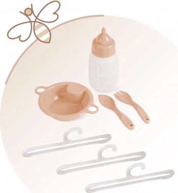 Enthalten ist alles, was kleine Puppeneltern brauchen: ein Mobile zur Unterhaltung der Puppe, ein Wickeltisch für die Pflege, ein Hochstuhl mit Fläschchen, Schüssel und Besteck sowie ein praktischer Kleiderschrank mit Reißverschluss und Kleiderbügeln. Der Liegebereich mit Netzfenster ermöglicht es Kindern, die Puppe stets im Blick zu behalten, und die großzügige Basis sorgt für Komfort beim Spielen.