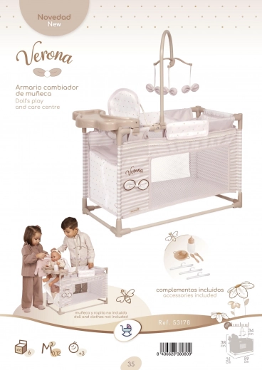 Das stilvolle Puppenbett aus der VERONA-Kollektion begeistert mit umfangreichem Zubehör und einem zarten, natürlichen Design. Es bietet ein Mobile mit Schleifchen, einen Wickeltisch, einen Hochstuhl mit Set sowie einen praktischen Kleiderschrank mit Reißverschluss. Dank der präzisen Verarbeitung und der einfachen Handhabung ist es ideal für Kinder ab 3 Jahren.