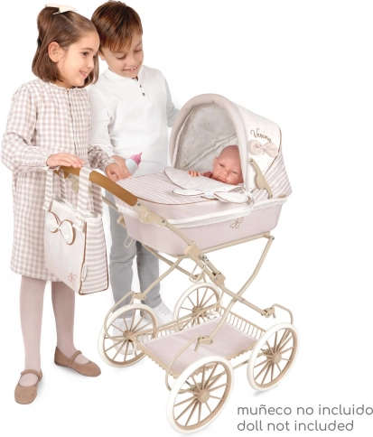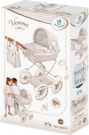 Die Verona-Kollektion überzeugt mit einer zarten Kombination aus hellem Beige und Weiß mit dezenten Streifen und Pünktchen, ergänzt durch elegante Schleifen und feine Stickereien. Der Wagen ist für komfortables Fahren von Puppen und einfache Handhabung konzipiert und lässt sich zudem leicht zusammenklappen, um Platz zu sparen.