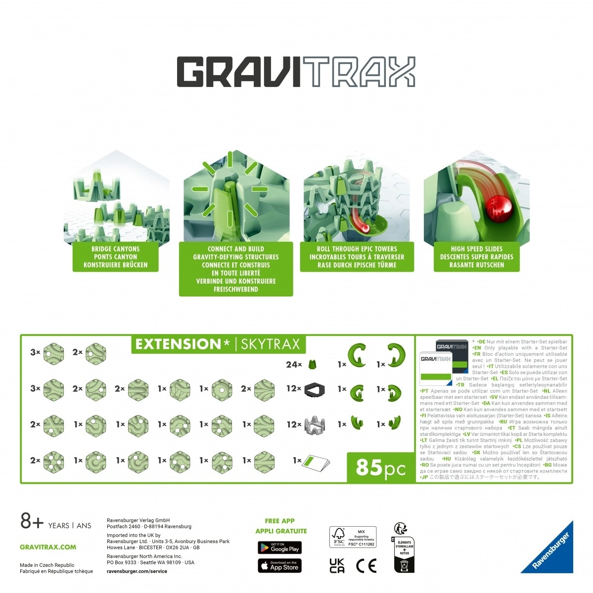 Das GraviTrax Skytrax Erweiterungsset hebt Ihre Kugelbahnen sprichwörtlich auf ein neues Level. Spezielle Verbindungs- und Bauelemente ermöglichen das Bauen auf mehreren Ebenen und führen die Kugeln über die Spielgrundplatte mittels clever konstruierter Brücken. So entstehen Bahnen voller Abfahrten, Beschleunigungen und flüssiger Übergänge zwischen den Ebenen.