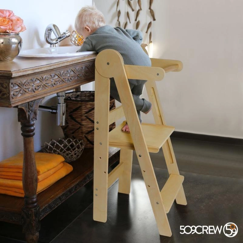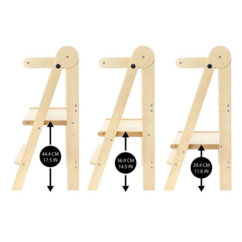 Durchdachtes Design ermöglicht Kindern ein sicheres und selbstständiges Hinaufsteigen dank einer Stufe in 16 cm Höhe. Der Turm ist klappbar, lässt sich leicht von der Küche ins Bad tragen und benötigt bei der Aufbewahrung nur minimalen Platz. Das geprüfte Holz enthält kein Formaldehyd, sodass Sie die Gewissheit eines gesundheitlich unbedenklichen Materials haben.