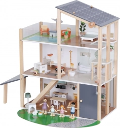 Dieses moderne Holzpuppenhaus bietet alles, was Kinder lieben: eine mit dem Wohnzimmer verbundene Küche, ein stilvolles Badezimmer mit Badewanne, ein Kinderzimmer, ein Schlafzimmer und eine geräumige Dachterrasse. Das verspielte Design, sanfte Farben und die hochwertige Verarbeitung machen das Haus zu einer schönen Ergänzung für Kinderzimmer und Spielräume.
