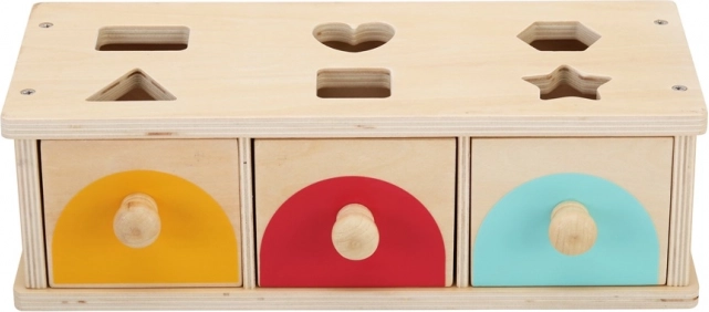 Die obere Platte mit Aussparungen führt das Kind zu präzisem Einsetzen, während drei Schubladen mit Griffen das einfache Entnehmen der Teile und wiederholtes Spielen ermöglichen. Die robuste Ausführung sorgt für Langlebigkeit und sicheres Spielen bereits ab 1 Jahr.
