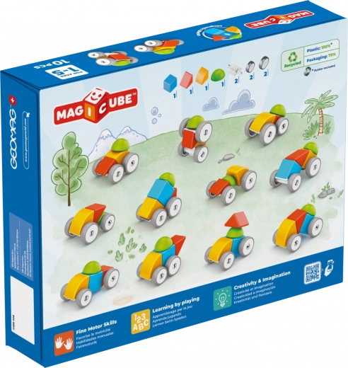 Entdecken Sie die kreative Welt mit dem magnetischen Konstruktionsspielzeug GEOMAG Magicube Auto mit 10 Teilen – einem sicheren und unterhaltsamen Spielzeug für Kinder ab 1 Jahr. Dank magnetischer Formen und Rädern mit zwei Fahrgestellen bauen Kinder mühelos ihr erstes Auto, fördern Feinmotorik, Fantasie und Koordination. Hergestellt in der Schweiz aus recyceltem Kunststoff.