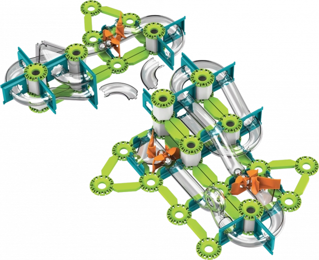 Grüne Schienen, Träger und orangefarbene Auslöser lassen sich leicht zu stabilen Strecken verbinden. Interaktive Elemente führen die Kugeln durch Kurven und Gefälle.