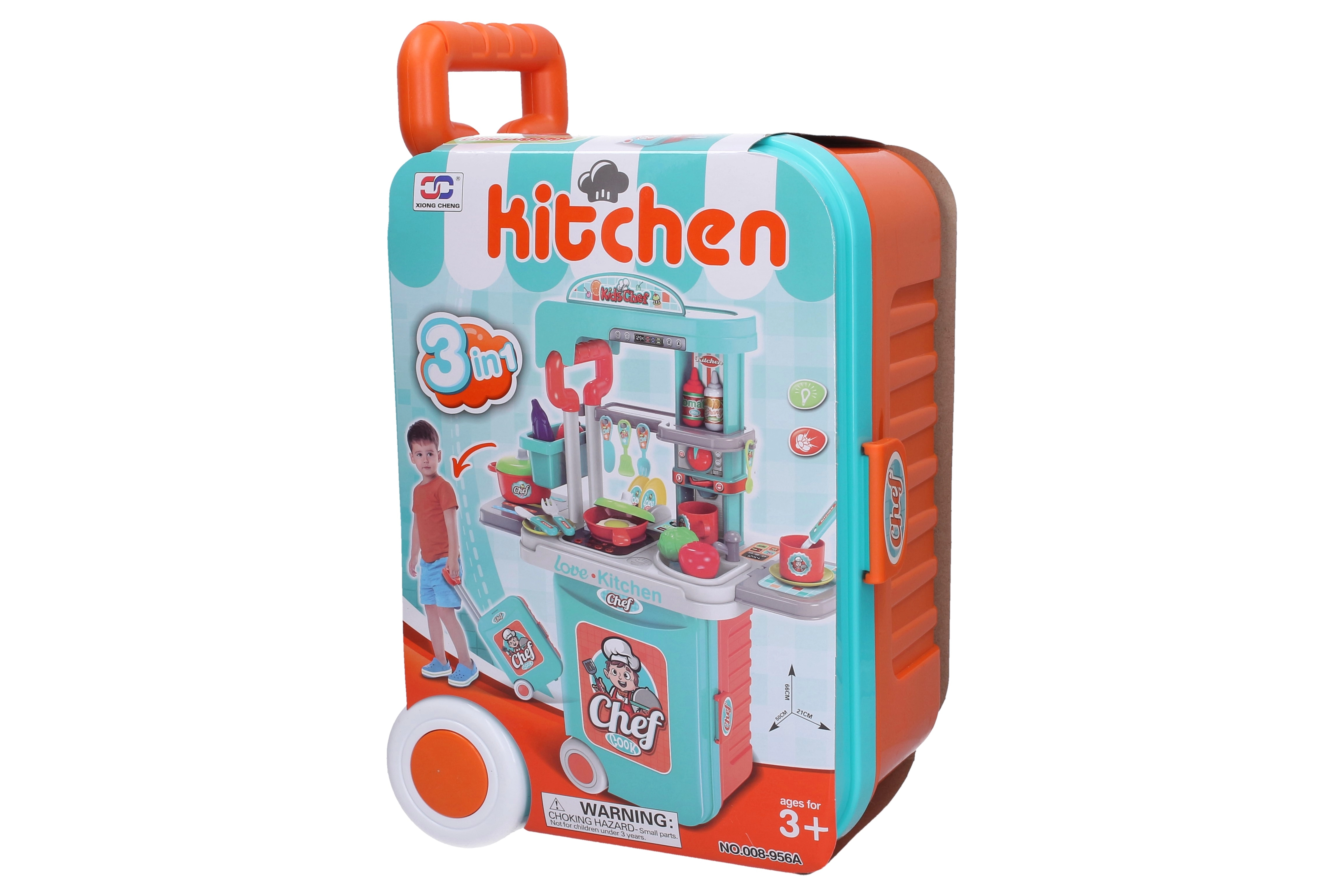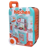 Diese portable Küche in Kofferform lässt sich einfach in ein Spielset mit den Maßen 66 × 50 × 21 cm umwandeln. Im Set enthalten sind Geschirr, Besteck, Lebensmittel und weiteres Zubehör, sodass Kinder sofort mit dem „Kochen“ beginnen können. Die Kochplatte leuchtet und gibt realistische Geräusche von sich, was die Fantasie anregt und für Spielspaß sorgt.