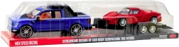 Der zweiachsige Anhänger ermöglicht ein leichtes Auf- und Abladen des Sportwagens. Der Geländepickup zieht den Anhänger zuverlässig und erweitert die Spielmöglichkeiten.