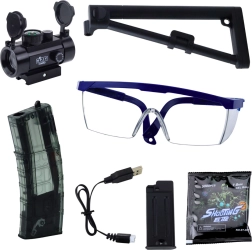 Gelpistole MK7, 7,4-V-Li-Akku, USB-Kabel, 2 Magazine, optisches Visier, Schutzbrille, taktische Schulterstütze, Packung Gelkugeln zum Einweichen, Originalverpackung