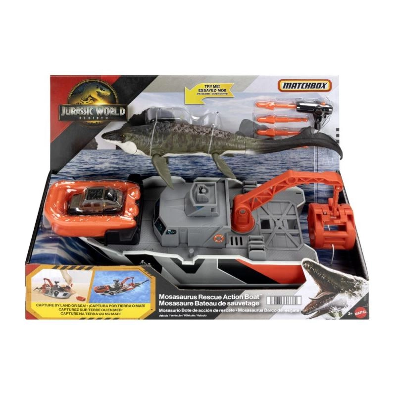 Entdecke unbegrenzte Spielmöglichkeiten und Geschichten aus der Welt von Jurassic World. Das Matchbox-Rettungsboot bietet realistische Details, funktionale Features und eine robuste Verarbeitung. Dank der Räder bewegt es sich auch an Land – so wechselst du nahtlos von Rettungseinsätzen auf dem Wasser zu Verfolgungen an Land.