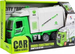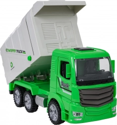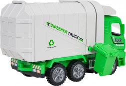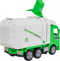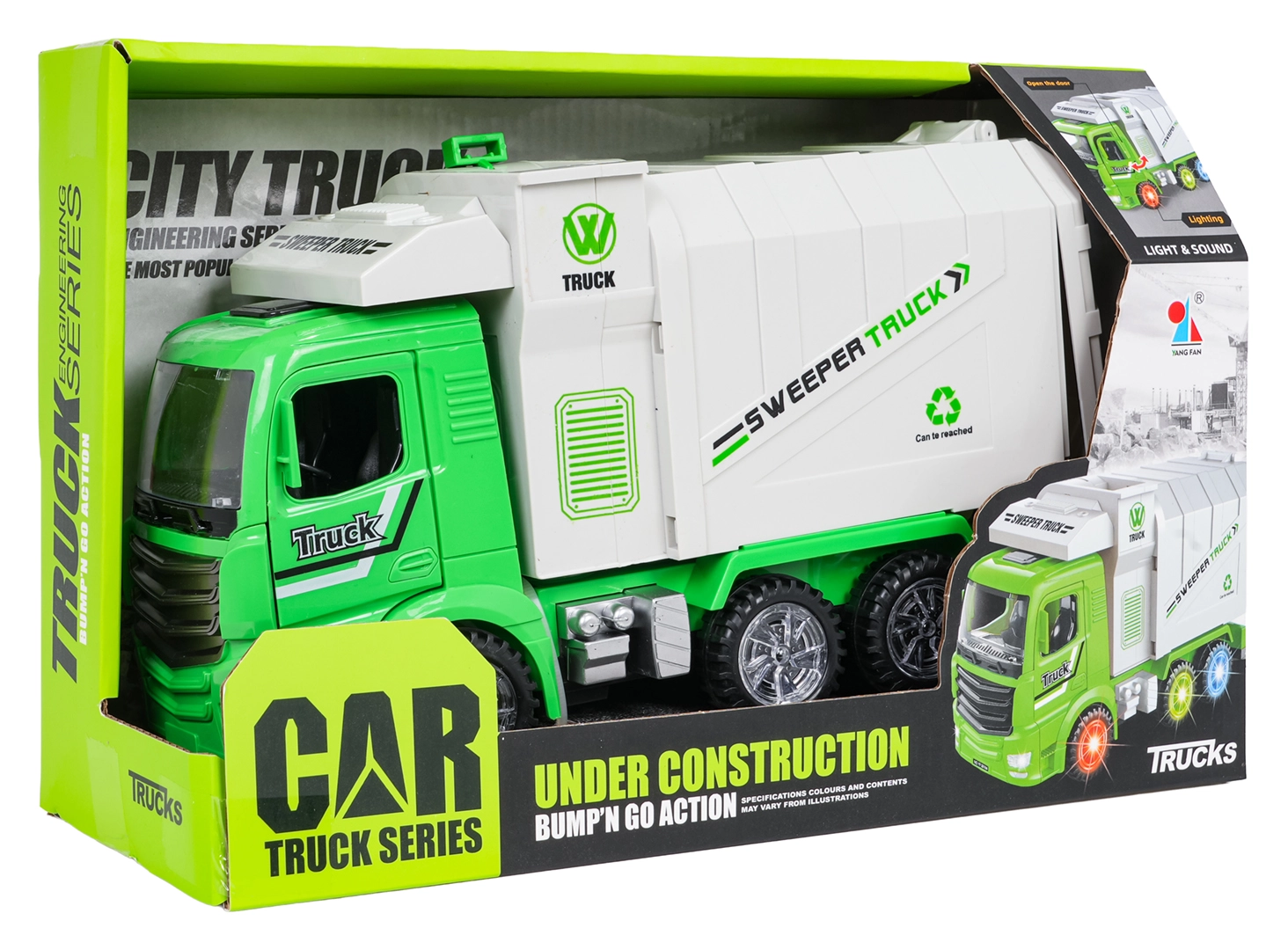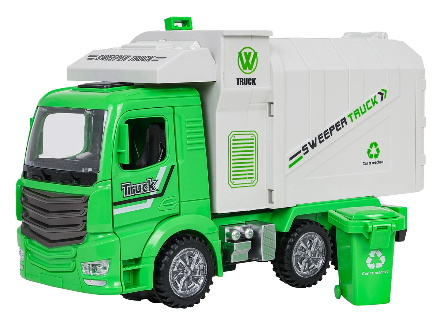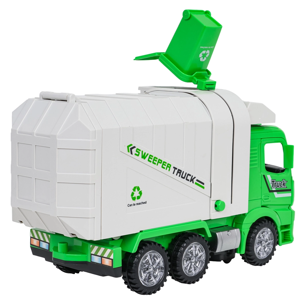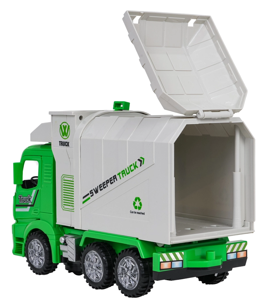 Soundeffekte wie Fahren, Bremsen, Hupe und eine fröhliche Melodie machen das Spiel besonders realistisch. Den beiliegenden Mülleimer können Sie einfach an die Seite des Fahrzeugs einhängen und den Inhalt in den Einfüllschacht kippen. Das Spielzeug wird mit 3× AA 1,5 V Batterien betrieben (nicht im Lieferumfang enthalten).