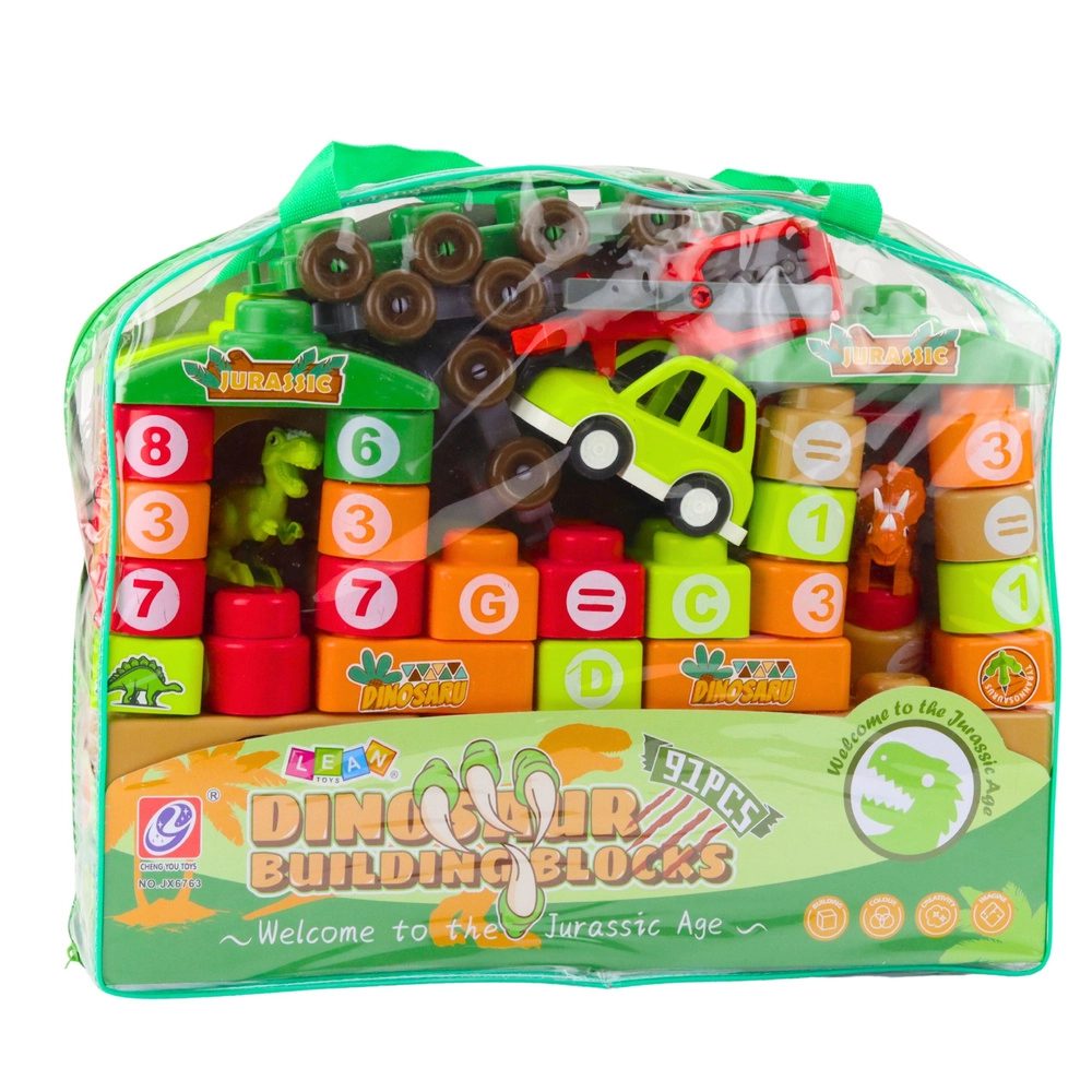 Buntes Konstruktionsset mit Dinosaurier-Motiv bietet 91 große Teile mit Buchstaben und Zahlen für spielerisches Lernen. Die Teile sind leicht, sicher und einfach zu verbinden – ideal für kleine Hände. Enthalten sind Fahrzeuge, eine Dinosaurierfigur und Zubehör, alles verstaut in einer praktischen Tasche für einfaches Mitnehmen.
