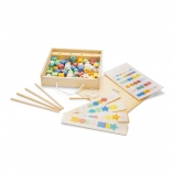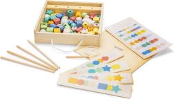 Das Auffädeln der Perlen auf Schnüre und Holzstäbchen unterstützt die Fingerfertigkeit und die Auge–Hand-Koordination – ideal für vorschulische Fähigkeiten.