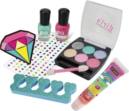 • Komplette Ausstattung: 2 farbige Nagellacke, Nagelsticker, Fingerstütze, Gesichtsmal-Set, Lipgloss.