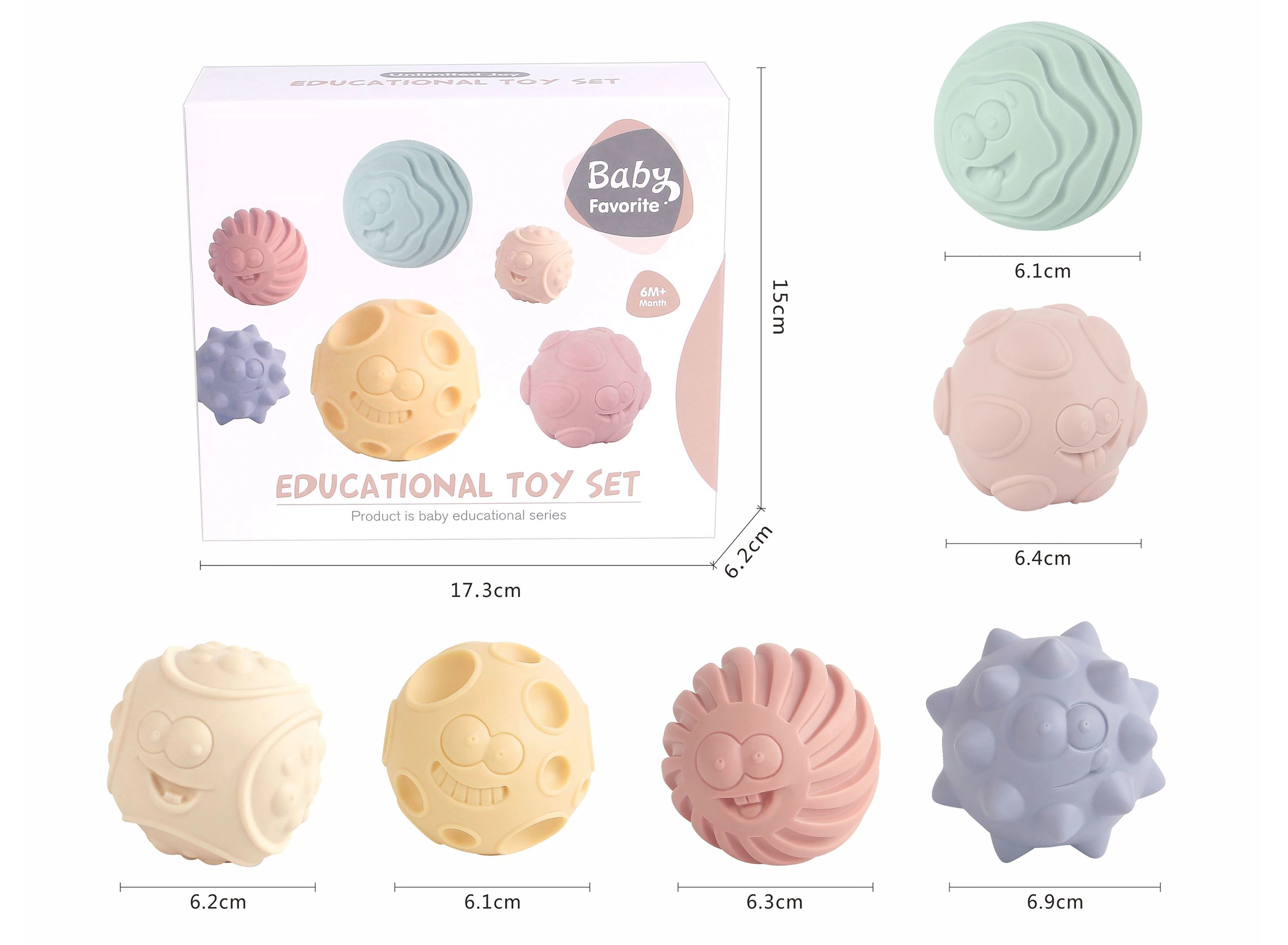 Ein unterhaltsames Set aus Motorikbällen für Kinder, das die Feinmotorik, die Sinneswahrnehmung und das taktile Erkunden fördert. Enthält 6 weiche Bälle mit einem Durchmesser von 6 cm und verschiedenen Texturen, die für kleine Hände sicher sind und beim Drücken quietschen – für noch stärkere sensorische Stimulation.