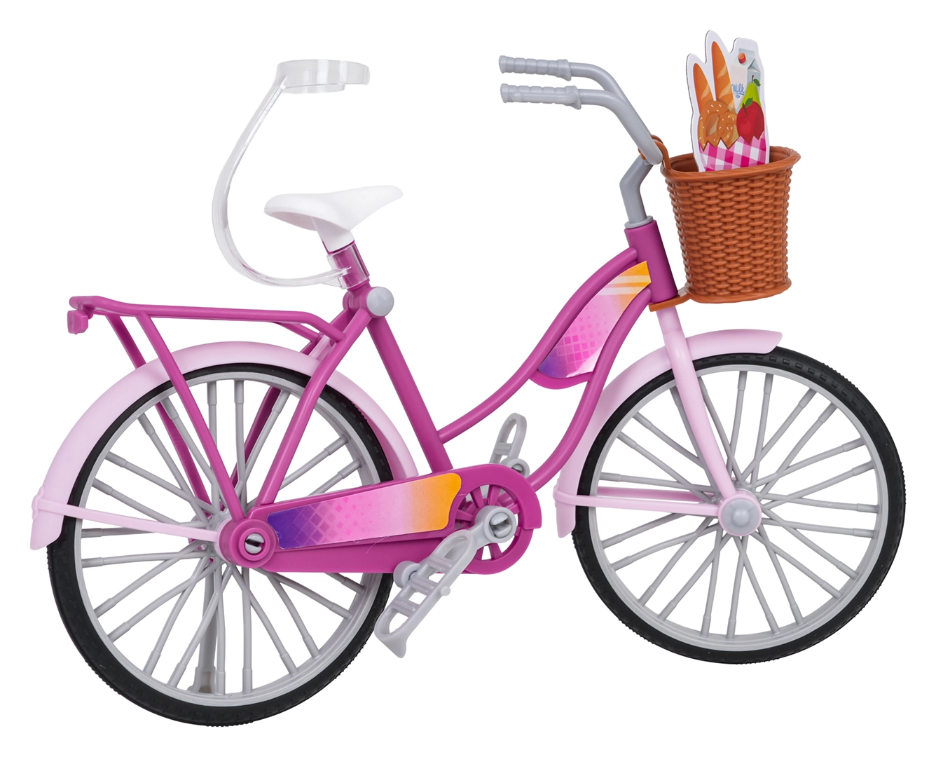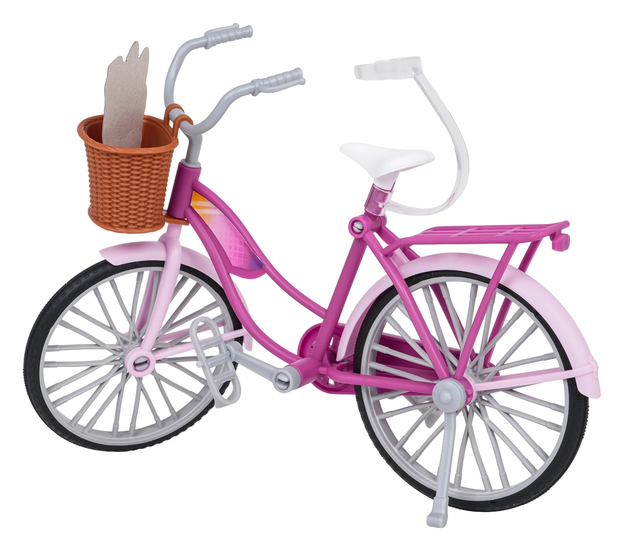 Die rosa Ausführung mit weißem Sattel und grauen Akzenten wird durch den vorderen Korb für Kleinigkeiten ergänzt – ideal für Ausflüge mit der Puppe.