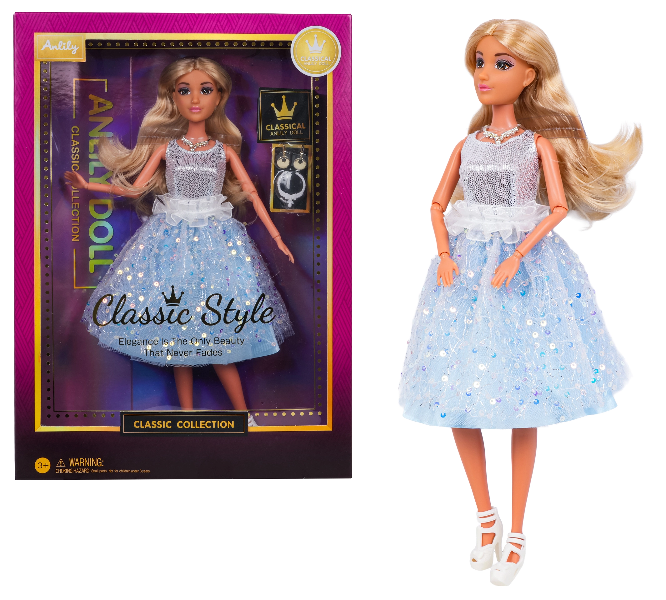 Im Set sind außerdem elegante Accessoires enthalten – Ohrringe und eine Halskette – mit denen Kinder Fantasie und Feinmotorik fördern. Die Puppe ist eine tolle Wahl als Geburtstags- oder Weihnachtsgeschenk und ergänzt jede Sammlung von Modepuppen perfekt.