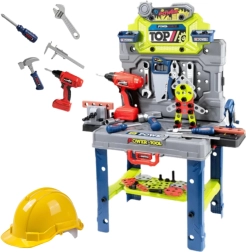 Der Tisch hat durchdachte Maße und Aufbewahrungselemente – Ablagen und Öffnungen für Werkzeuge – damit alles übersichtlich griffbereit ist. Die größte Attraktion ist der elektrische Schrauber, betrieben mit 2× 1,5 V AA (im Lieferumfang), der Bohren und Schrauben wie in einer echten Werkstatt ermöglicht. Die Farbkombination und die Vielzahl an Komponenten regen zur Erstellung eigener Projekte und Konstruktionen an.