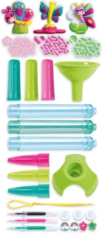 - Kunststoffständer und Trichter, 3 transparente Stiftröhrchen, 3 Stopfen, 3 Kappen mit Endstücken, 3 Tintenpatronen in 3 Farben, 3 Beutel mit Verzierungen in verschiedenen Formen und Farben, 8 Kunststoffperlen, elastische Schnur, 3 Gummifiguren, Anleitung