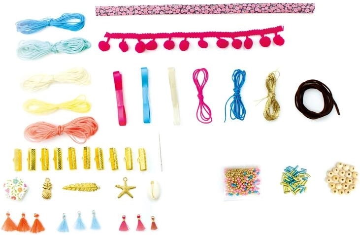 25 m Baumwollgarn, 1,5 m gewachstes Garn, 100 Perlen, 16 Holzperlen, 30 Röhrenperlen, 25 cm Lederschnur, 25 cm Bommelband, 3 Stahlanhänger, 1 Muschel, 1 bedruckte Perle, 75 cm Band, 5 Ketten mit Verschluss, 10 große Verschlüsse, 1 Nadel, 9 Bommeln, 25 cm bedrucktes Band, 5 Armband-Endkappen, 2 Ständer für Armbänder
