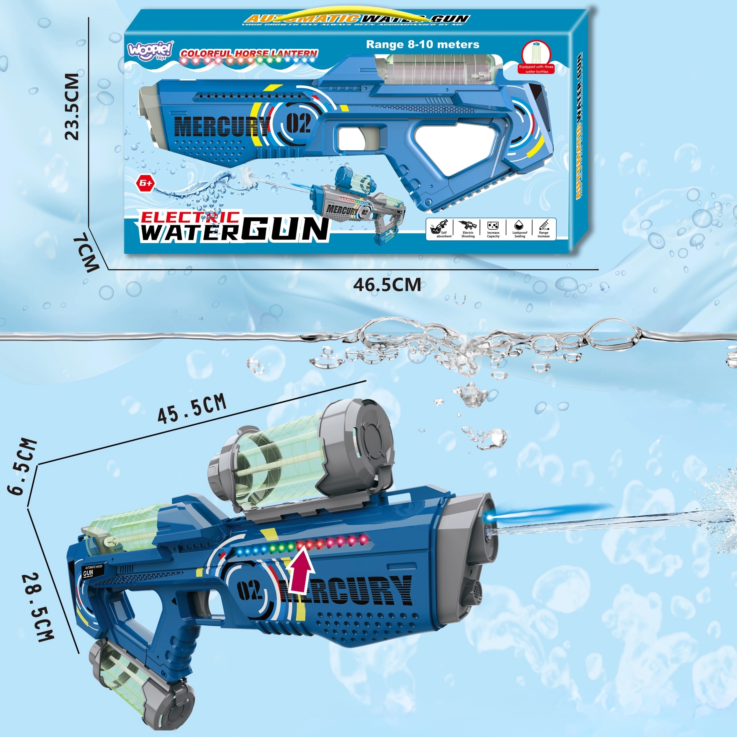 Die elektrische Wasserpistole WOOPIE MERCURY 02 ist für maximalen Komfort und Spaß konzipiert. Dank des automatischen Betriebs musst du nicht pumpen – einfach den Abzug drücken und einen kontinuierlichen Wasserstrahl genießen. Der 2200-mAh-Akku sorgt für lange Laufzeit pro Ladung und eine LED-Anzeige informiert dich über den Ladestatus.