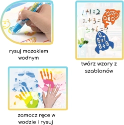 Im Lieferumfang enthalten sind Wasserstifte, Schaumstempel und ein Heft mit Ideen, die zu neuen Bildern und Mustern inspirieren. Dank der größeren Abmessungen ist die Matte ideal auch für gemeinsames Gestalten von Geschwistern oder Eltern mit Kindern.