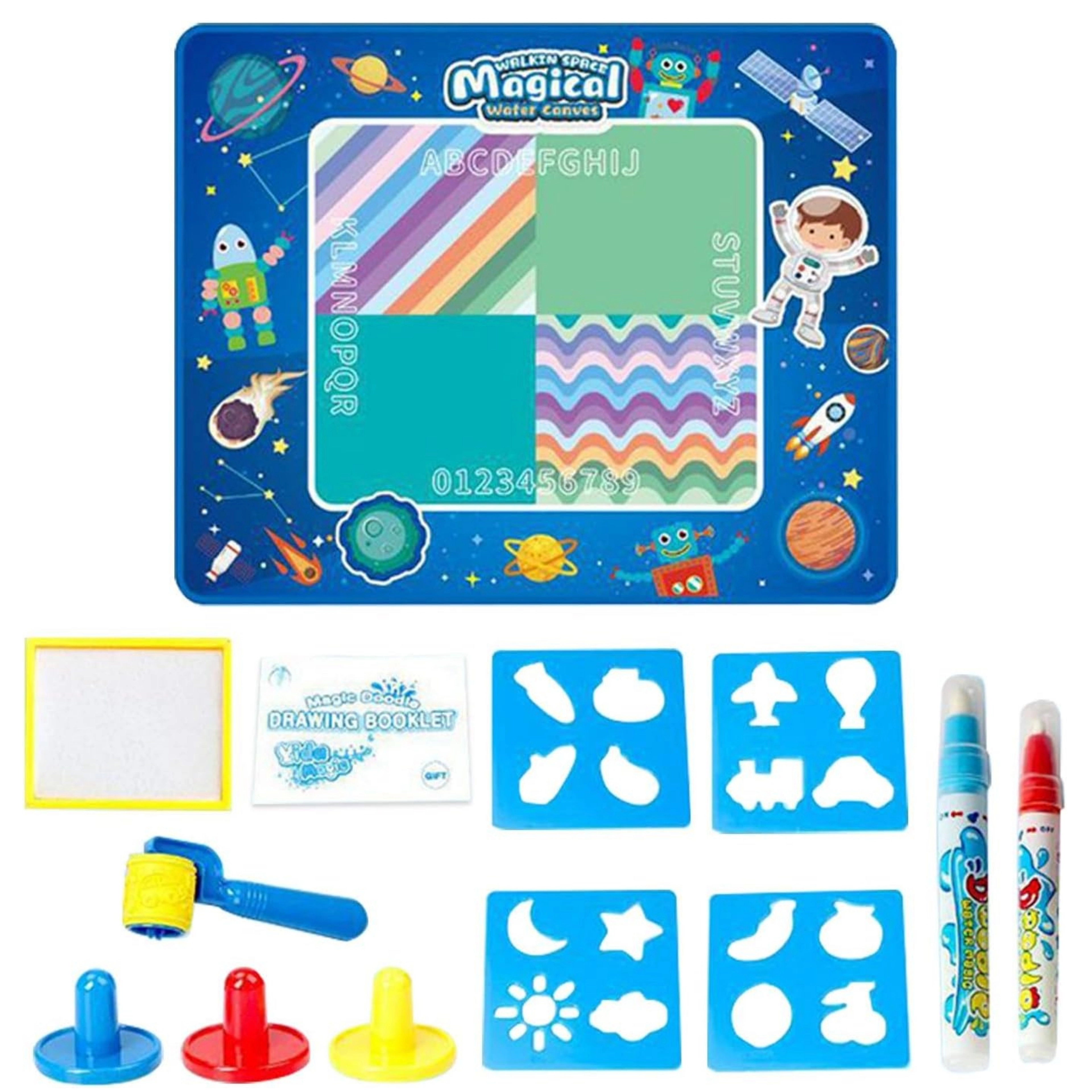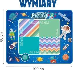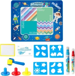 Entdecken Sie die spielerische Welt des Malens mit Wasser. Die WOOPIE-Matte ermöglicht Kindern das Malen ohne Tinte und Farben – einfach die beiliegenden Stifte mit Wasser füllen und loslegen. Die schnelltrocknende Oberfläche hält die Umgebung sauber und die Bilder verschwinden von selbst innerhalb weniger Minuten. Das Weltraum-Design mit Planeten, Raketen, Robotern und Astronauten macht jede Zeichnung zu einem galaktischen Abenteuer.