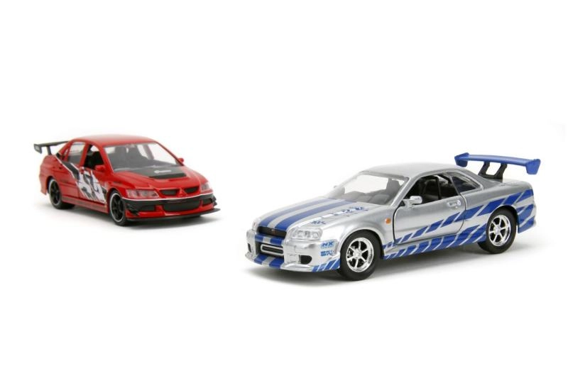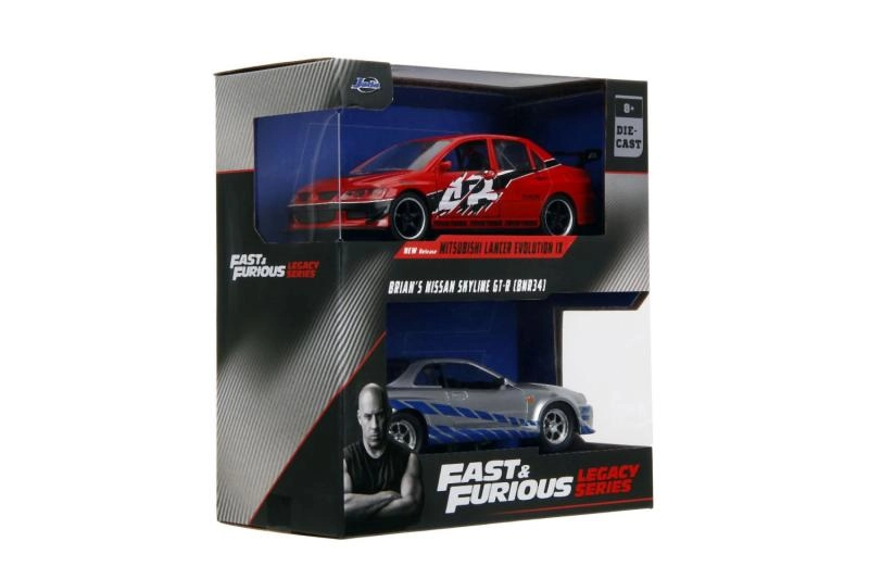 Erhalte gleichzeitig den Mitsubishi Lancer Evo IX 2006 und Brians Nissan Skyline GT‑R R34 – das ikonische Duo aus Fast & Furious im Maßstab 1:32.