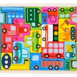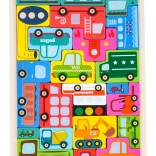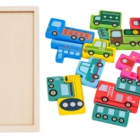Das Holz-Puzzle-Set mit dem Thema Fahrzeuge umfasst 23 Teile mit Illustrationen wie Polizei, Feuerwehrwagen, Bus, Krankenwagen, Taxi, Betonmischer, Lader, Gabelstapler und mehr. Die Aufgabe des Kindes ist es, Formen zuzuordnen und die Teile zusammenzusetzen und in die Grundplatte einzusetzen, wodurch Feinmotorik, Vorstellungskraft und logisches Denken gefördert werden.