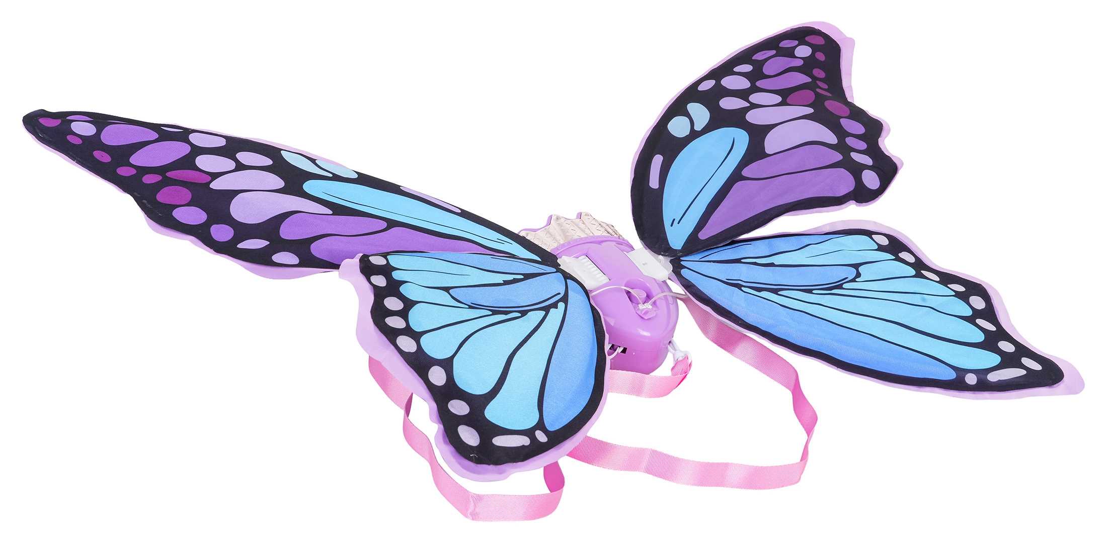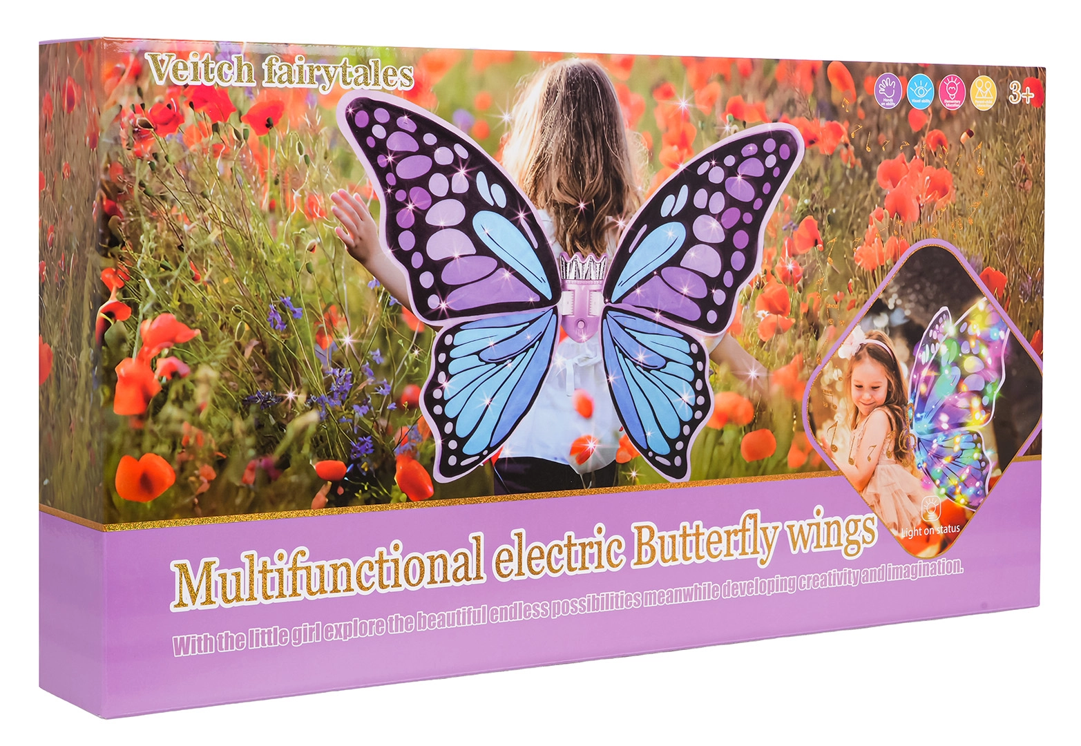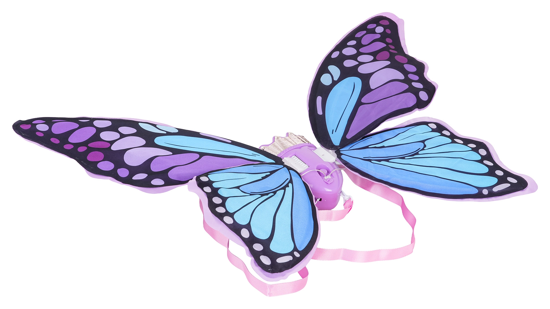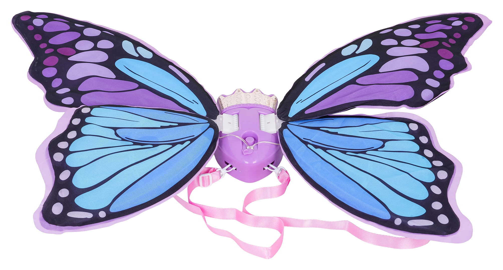 Zauberhafte Schmetterlingsflügel in Lila- und Blautönen bringen jede Kinderparty zum Strahlen. Die leichte Konstruktion und weichen Gurte sorgen für Komfort, während integrierte Lichteffekte und Melodien die kindliche Fantasie anregen.