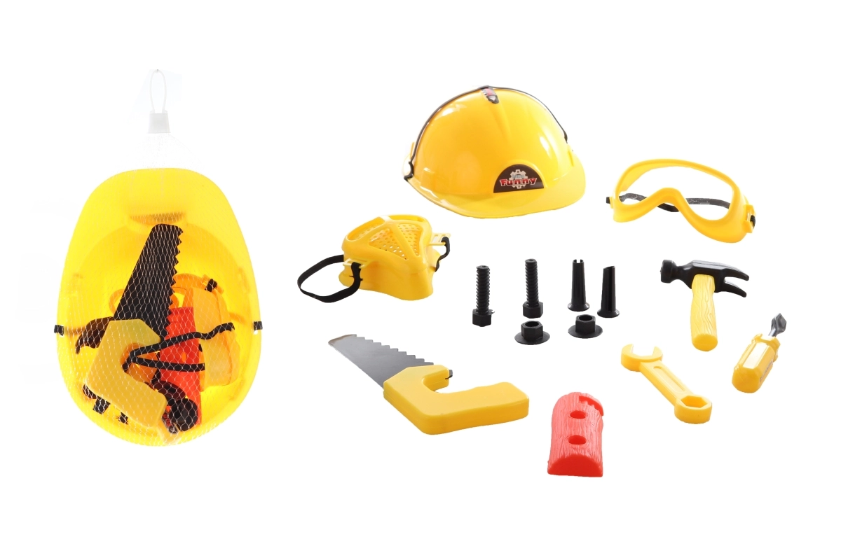 Dieses Kinder-Werkzeugset mit Helm bietet Kindern ein authentisches Erlebnis handwerklicher Tätigkeiten. Dank des leichten Helms, der Schutzbrille und der Maske können Kinder sicher spielen und die Welt der Erwachsenen nachahmen. Enthalten sind beliebte Werkzeuge wie Säge, Hammer, Schraubendreher und Schlüssel, ergänzt durch Schrauben und Holzimitate zum Üben des Schraubens.