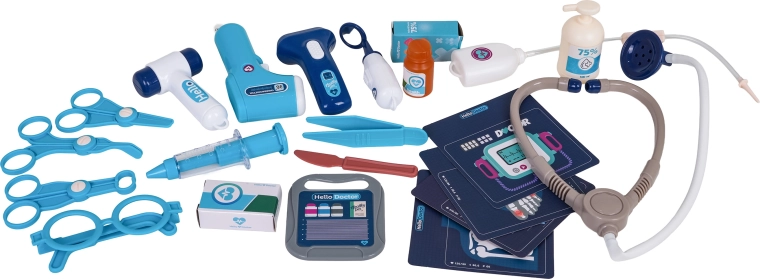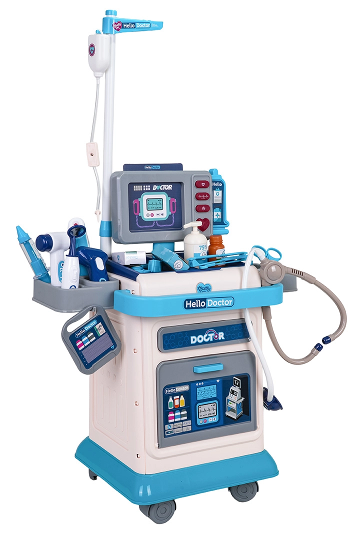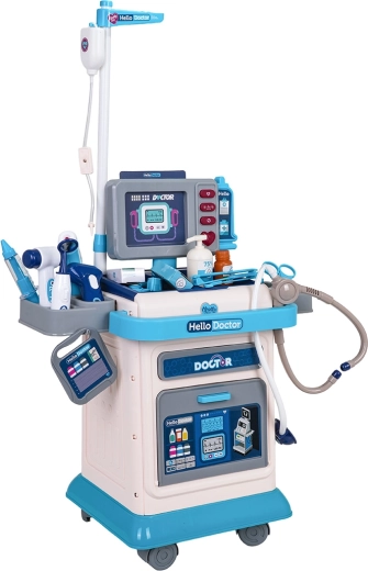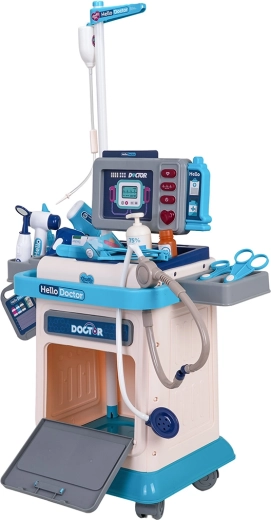 In dem Set finden Kinder alles Nötige: Stethoskop, kontaktloses Thermometer mit Licht, Spritze, Schere, Pinzette, Spiegel, neurologischer Hammer, Brille sowie kleine Extras wie Patientenkarte, Fläschchen mit „Desinfektion“, Schachtel mit Pflastern und Medikamenten sowie ein IV-Ständer. Der Wagen verfügt über eine praktische Schublade und Halterungen für eine übersichtliche Aufbewahrung der Instrumente.