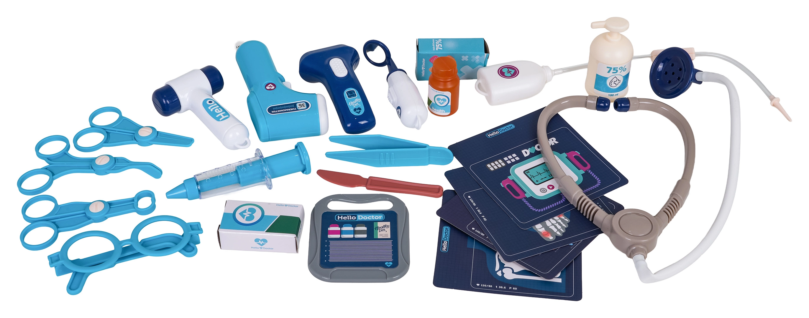 Stethoskop, kontaktloses Thermometer mit Licht, Spritze, Schere, Pinzette, Spiegel, Hammer, Brille, Patientenkarte und weiteres Zubehör für kreatives Spielen.