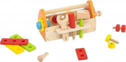 Die praktische tragbare Kiste hält alle Teile beisammen. Kinder können ganz einfach stecken, schrauben und hämmern – zu Hause und unterwegs.