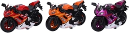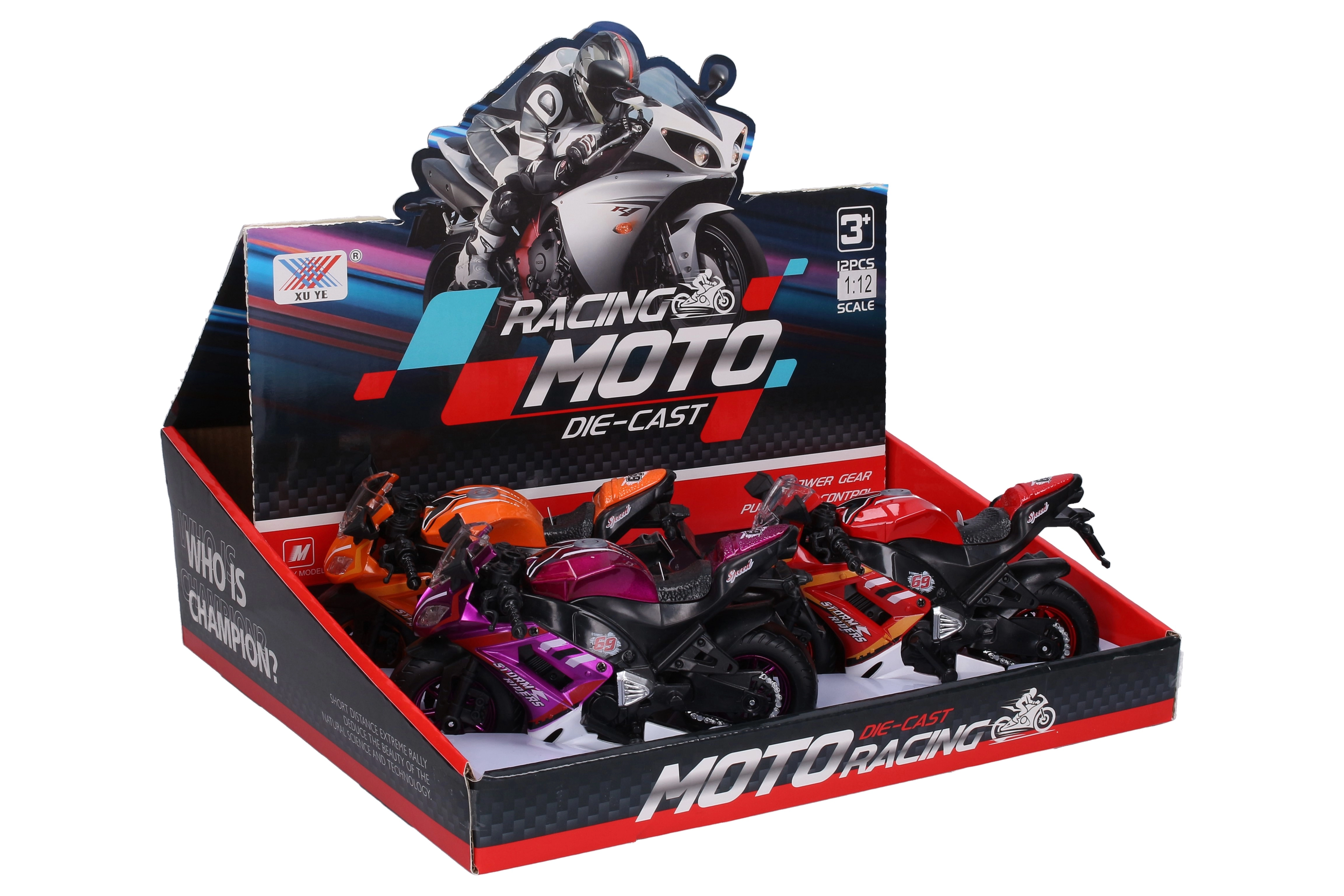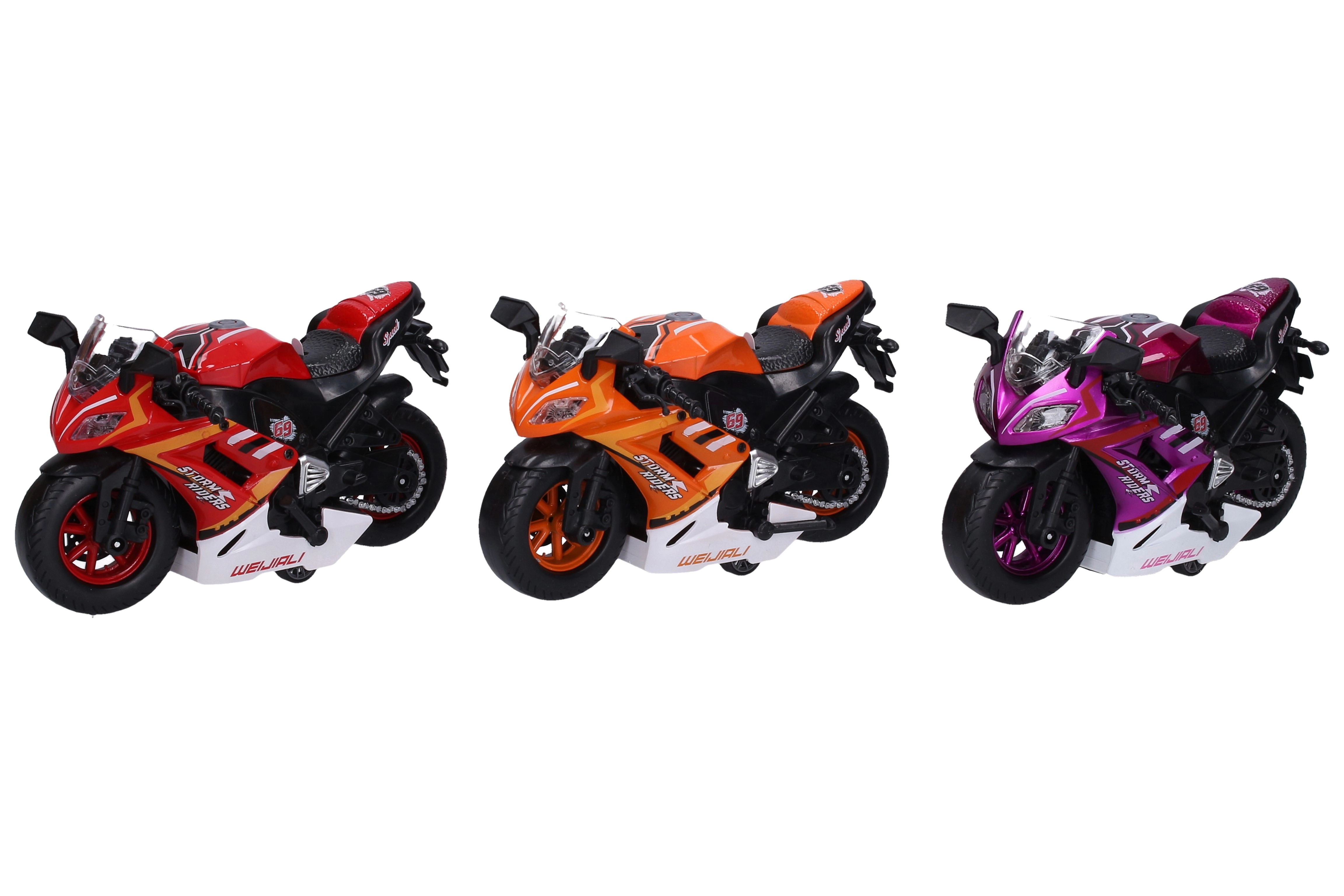 Dieses Rückzieh-Motorrad begeistert Kinder durch die realistische Ausführung und Effekte, die jedes Spiel intensivieren. Einfach mehrmals über eine ebene Fläche zurückziehen, und das Motorrad fährt von selbst nach vorn. Lichter und Geräusche sorgen für die richtige Renn-Atmosphäre.