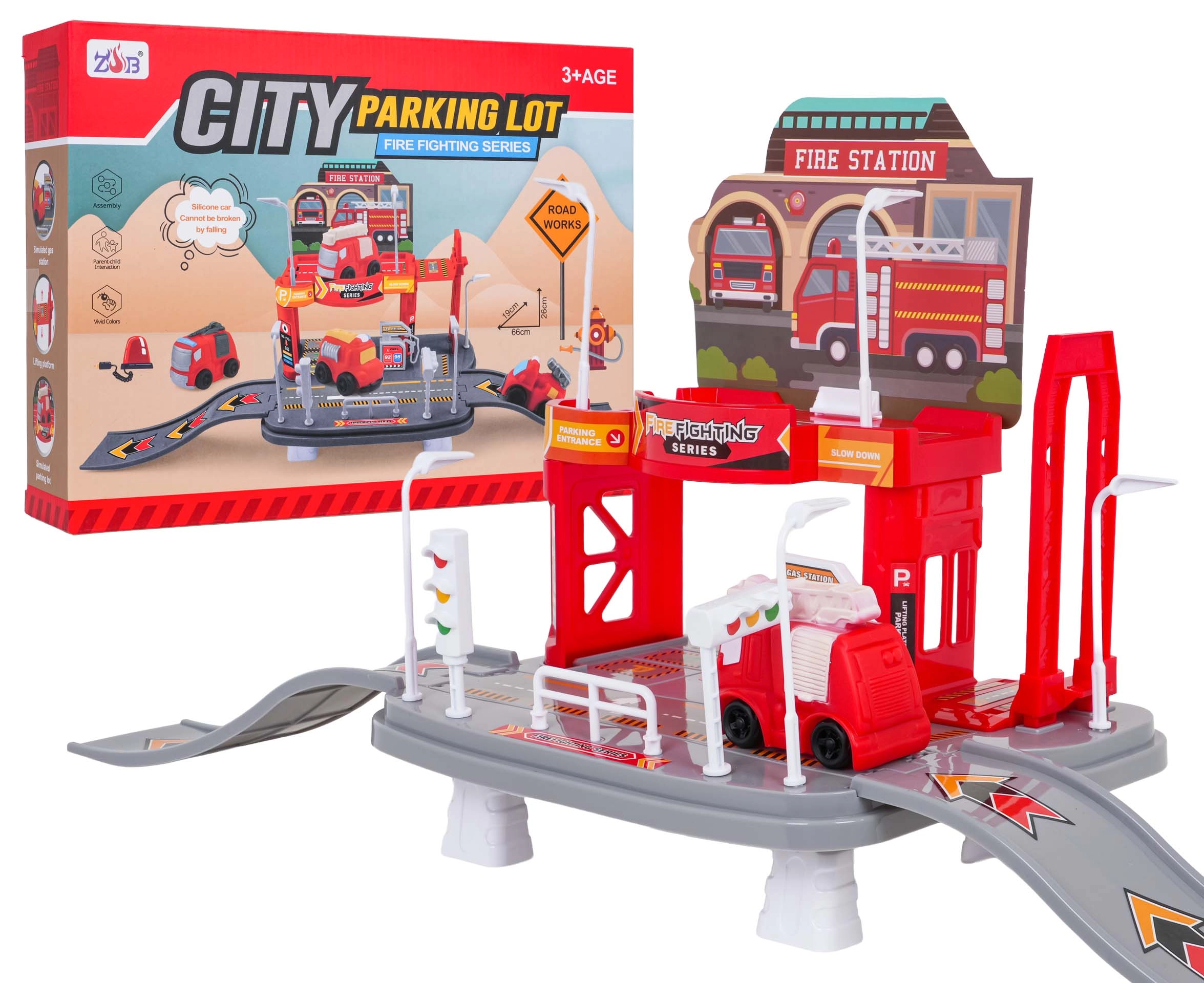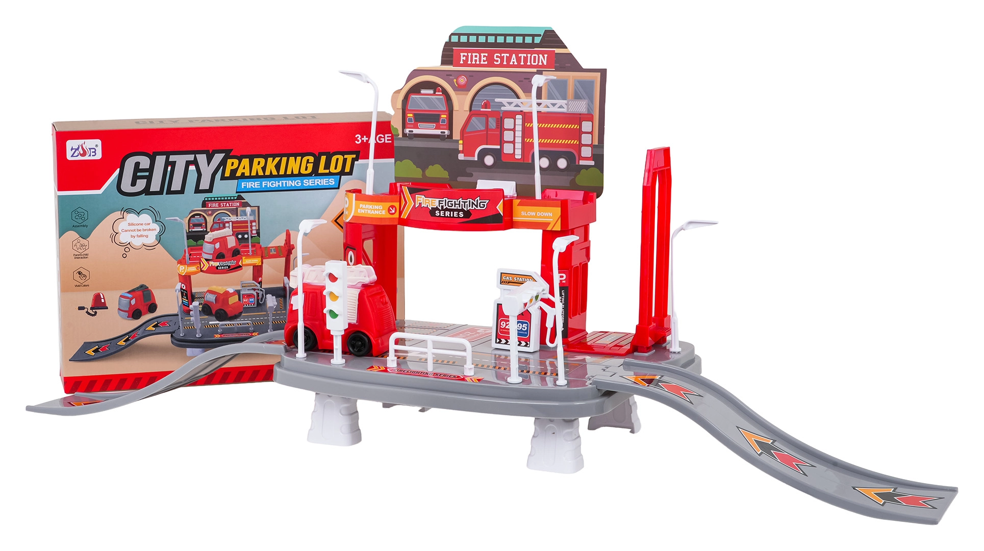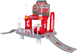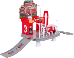 Diese detailreich gestaltete Feuerwache auf erhöhter Basis bietet Kindern stundenlanges fantasievolles Spiel. Zwei Ebenen mit Parkplätzen, Abfahrten und einem manuell bedienbaren Aufzug fördern die Motorik und regen Rollenspiele an. Die untere Ebene wird durch eine Tankstelle, Verkehrsschilder, Lampen und Ein-/Ausfahrt in Form von Rutschrampen ergänzt.