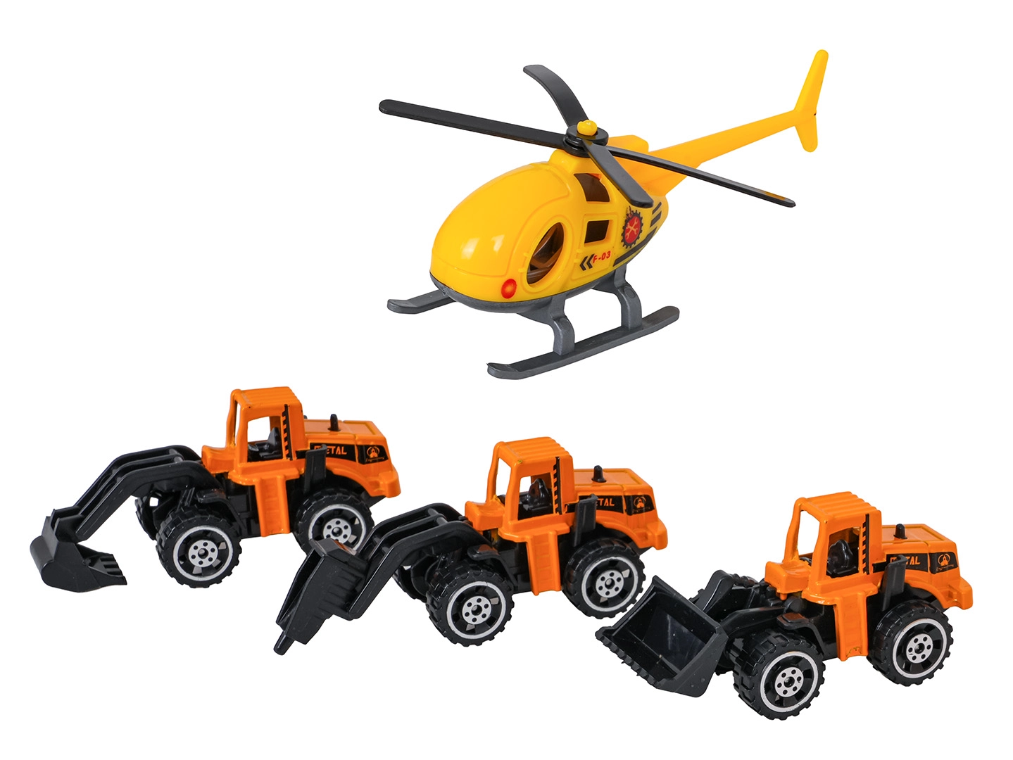 Im Set enthalten sind drei Metallmaschinen mit beweglichen Teilen und ein gelber Helikopter für Einsätze aus der Luft. Bereit für actionreiche Missionen auf der Baustelle.
