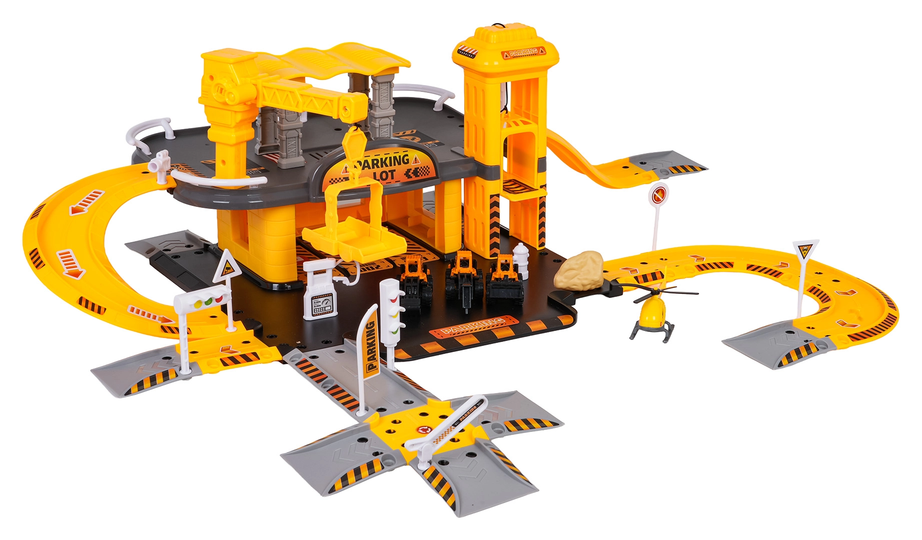 Unteres Geschoss mit Straße und Tankstelle, oberes Geschoss mit Baustellenbereich und funktionalem Kran. Realistisches Bauspiel für jeden Tag.