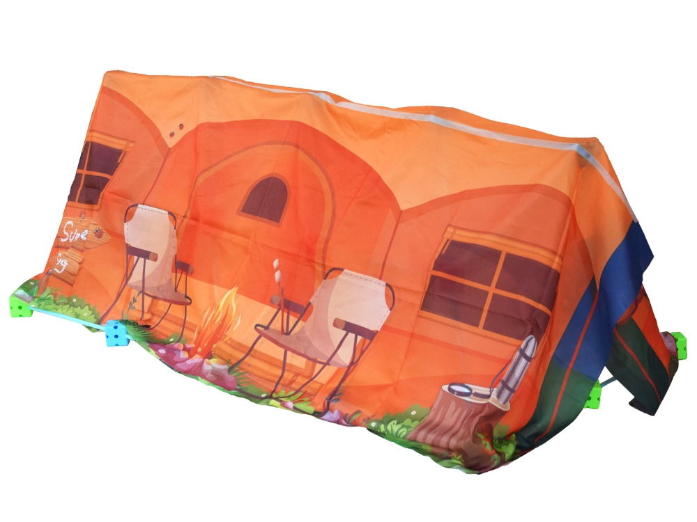 Enthalten ist eine farbenfrohe Textilplane mit Campingmotiv. Einfach über die Konstruktion legen und schon entsteht ein gemütlicher Spielbereich.